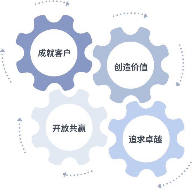 成就客户是一切决策的出发点,,,创造价值是衡量所有工作的标准,,,追求卓越是我们做事做人的态度,,,,开放共赢是我们的格局也是最终的结果。。。。价值观的齿轮环环相扣,,,,推动着组织里的每个人不断向前。。