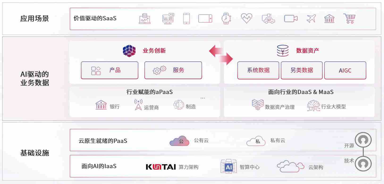 数字时代,,,,围绕企业数字化转型的关键要素,,,,k豆钱包数码开创性的提出数云融合战略和技术体系框架,,着力在云原生、、、、数字原生、、、、AI原生和信创产业上架构产品和服务能力,,,为处在不同数字化转型阶段的快消零售、、汽车、、金融、、、、医疗、、政企、、教育、、运营商等行业客户提供泛在的敏捷IT能力和融合的数据驱动能力,,构建跨界融合创新的数字业务场景和新业务模式,,,,助力企业级客户建立面向未来的核心能力和竞争优势,,,,全面推动社会的数字化、、、智能化转型升级。。。。