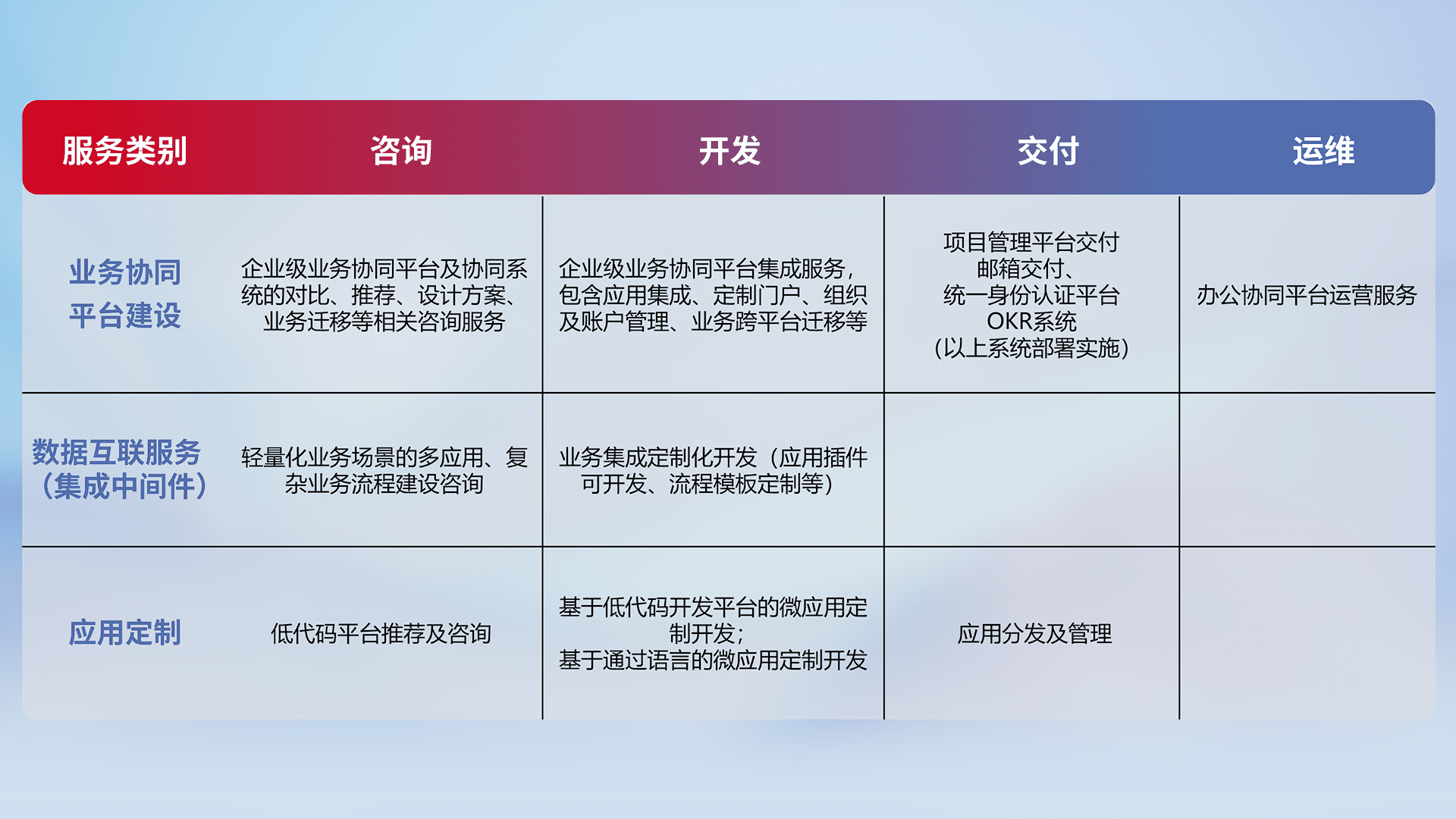 针对钉钉、、、、企微、、、、IDaas等平台级产品提供产品的规划、、、、方案、、、交付、、、定制化开发等服务,,,实现如统一协同办公、、智能客户服务、、、混合会议管理、、、智能数据查询、、、、等业务场景,,实现数字化转型。。。。