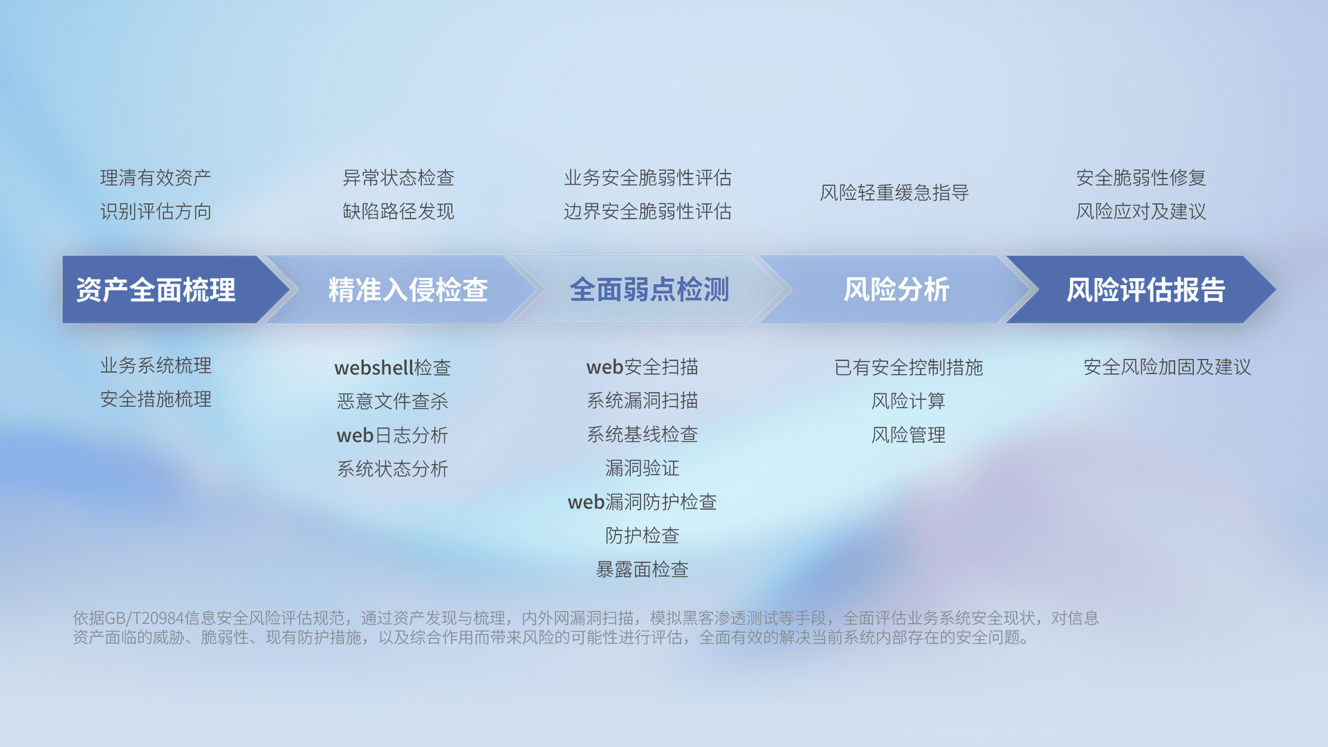 针对客户行业特性,,,以专业的安全服务+多厂商联合解决方案提供专属的一站式安全管理服务,,,帮助客户全面感知网络空间威胁,,基于识别、、、、检测、、分析、、防护、、、、监测、、响应的服务理论模型,,从方案咨询、、集成交付、、、评估验证、、优化加固、、运维运营,,,,致力于为客户提供完整的闭环管理式安全服务。。。以实战经验为客户打造高抵御风险的安全体系,,,帮助客户发现威胁、、对抗威胁、、、处置威胁,,不断积累安全对抗能力,,持续保障数字化安全。。。
